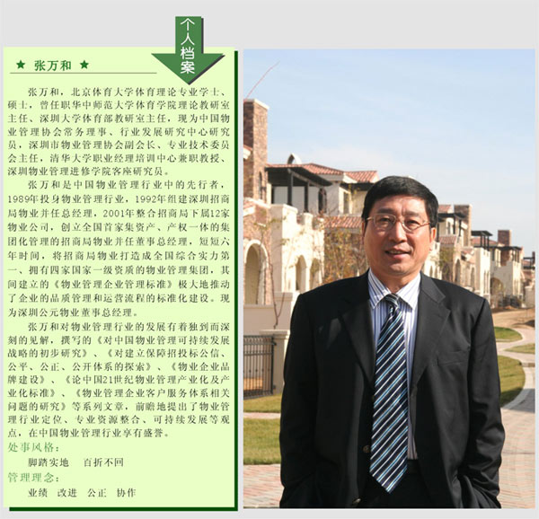在业内,很多人用“物业管理行业的先行者”来描述公元物业董事总经理、原招商局物业董事总经理张万和,但我更愿意用“物业管理行业百折不回的求索者”来概括他。因为前者只是总结他的成绩,而后者让我们看到他在人生跋涉中的探求与坚守。投身行业,满怀挚爱,上下求索,百折不回……